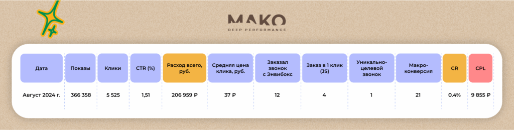 Компания реализовывала продукцию исключительно через онлайн-канал. Сказывалось отсутствие физического шоу-рума. Контекстная реклама настраивалась на сайт. Эффективность отслеживалась системой коллтрекинга Callibri. Лидов привлекали, но недостаточно и дорого они обходись. Показательным примером послужил август 2024 года, когда получили 21 обращение при стоимости лида — 9 855 рублей.
