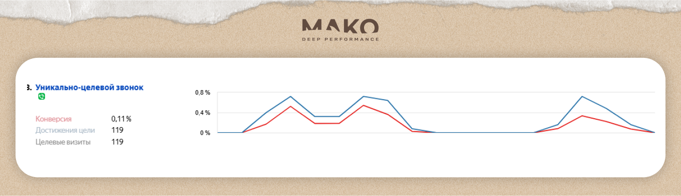 - Целеполагание на основе каналов продаж. Анализ данных показал, что ключевыми точками контакта являются: звонки (81% продаж) и заявки с сайта (19%). В соответствии с этим, в качестве основной цели для оптимизации рекламных кампаний были выбраны действия, ведущие к звонку: «заказ звонка» и «уникально-целевой звонок».