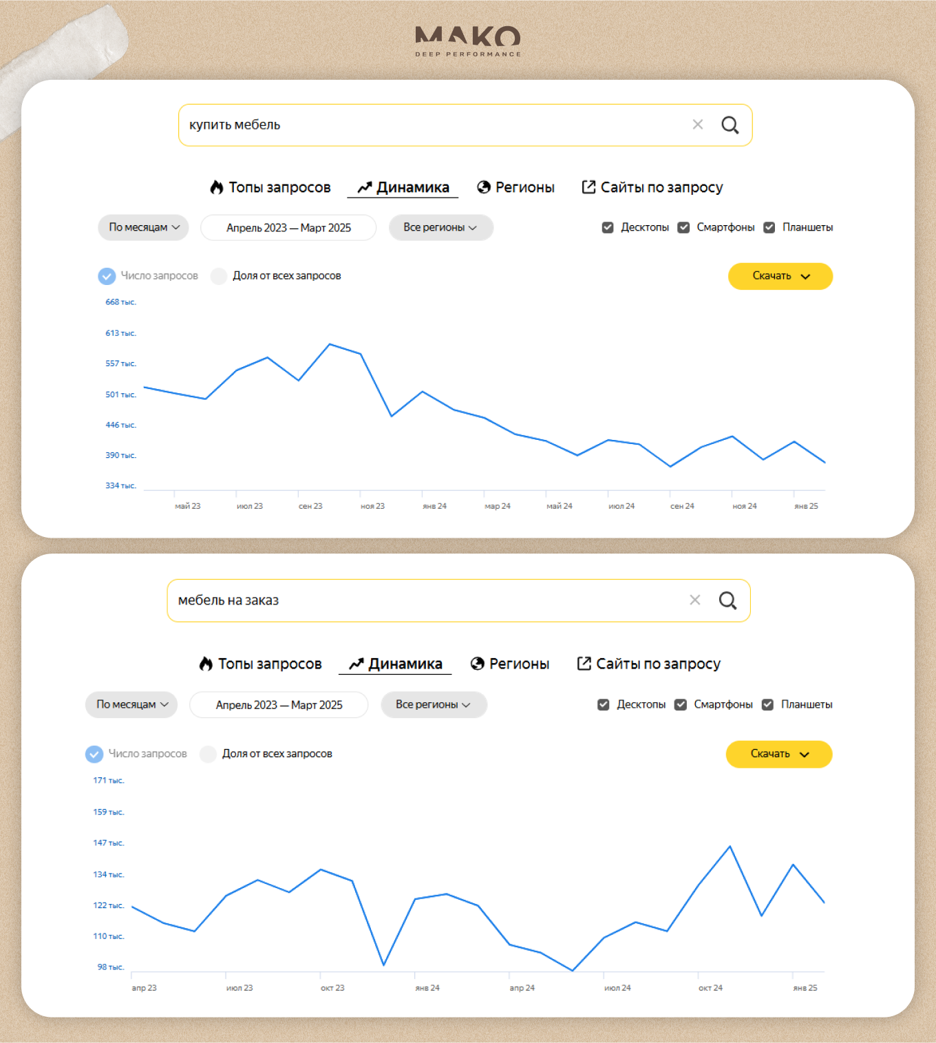 Производитель сконцентрировался на продвижении готовой мебели. Ведь она популярна на рынке. В сегменте «мебель» на неё действительно самый большой спрос. Рекламировать услугу «мебель из массива на заказ» изначально считалось не самым прибыльным делом. Это логично и подтверждалось разницей в частотности ключевых запросов:
