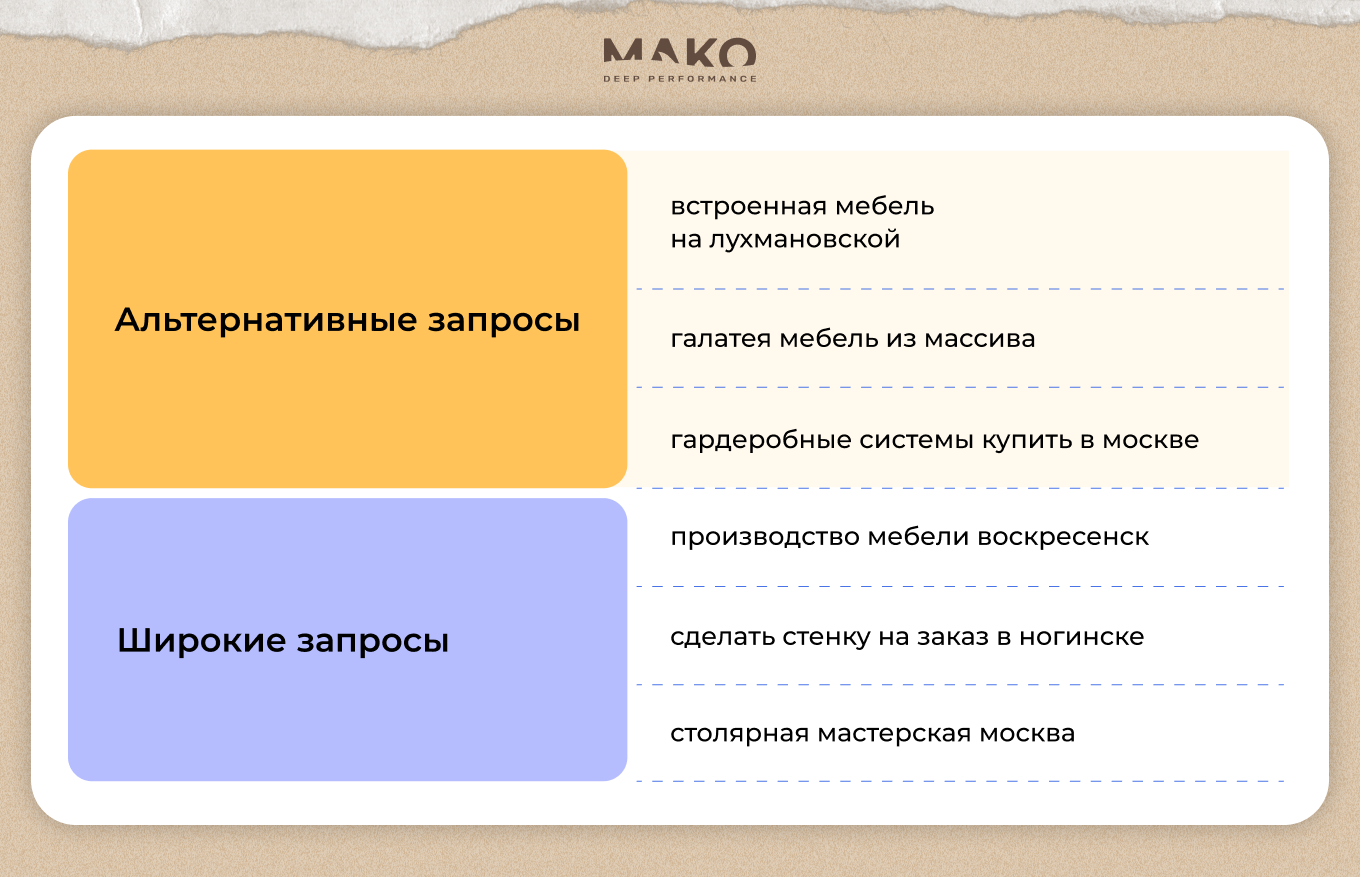 - Актуализация семантического ядра. Фокус смещен с широких запросов на более узкие и релевантные, отражающие конкретную потребность. Например, «купить мебель в гостиную из массива дерева», «купить шкаф из массива дерева от производителя».