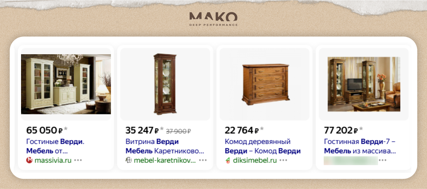- Невозможность отстроиться от конкурентов в узкой нише. Для истинных ценителей мебели из массива, продукция фабрики, выполненная в популярной традиционной манере, не обладала достаточной уникальностью. Специфика спроса в сегменте формирует множество аналогичных предложений. Затруднительно разработать эффективное позиционирование, чтобы выделиться. Масштаб трудностей виден на скриншоте галереи Яндекс.Товары.
