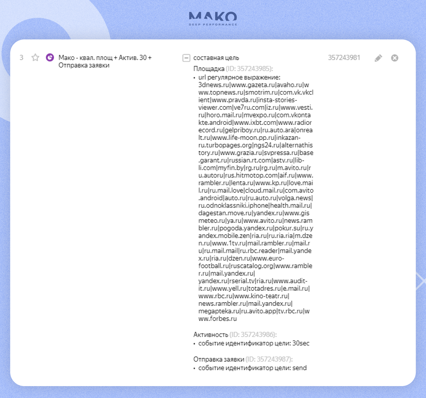 - Внедрение микроконверсий. Для отсева ботов и нецелевых пользователей использовалась составная цель: переход с качественной площадки + проведение на сайте более 30 секунд + отправка заявки.
