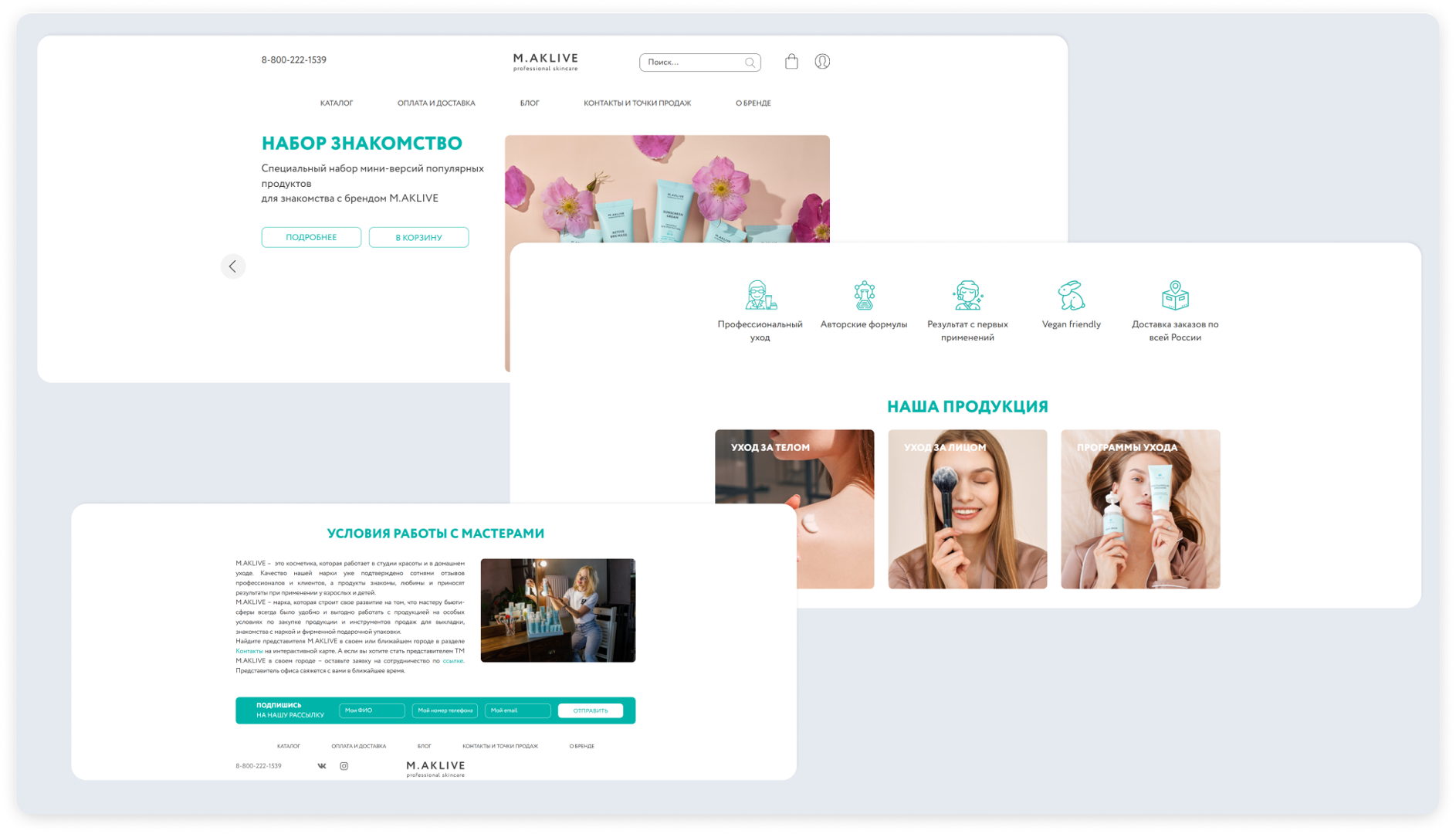 В beauty-индустрии сайт — это виртуальная витрина. Если она выглядит неопрятно, бренду будет сложнее отстоять свое позиционирование. Дизайнеры агентства разработали визуальный язык, который полностью отражает премиальность бренда Maklive.