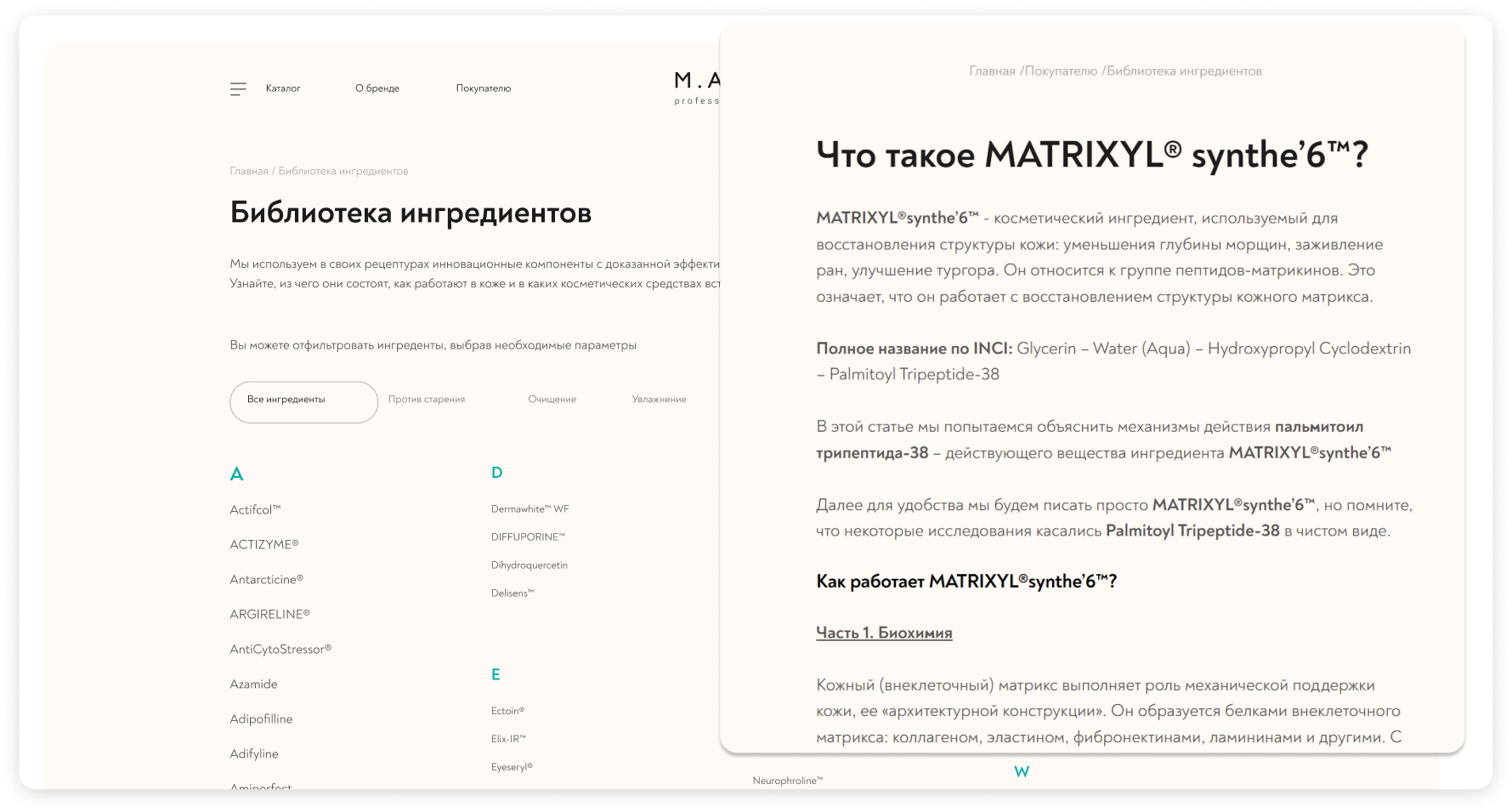 - Библиотека ингредиентов: интерактивный справочник, где расписан каждый компонент состава и его свойства. Это снимает возражения о «химии» и показывает экспертность бренда.