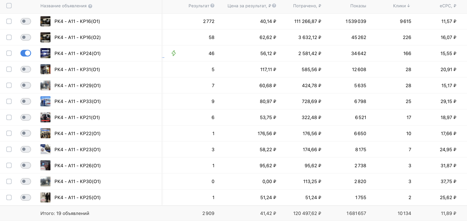 - Креативы и тексты: На текущий момент разработано и протестировано более 50 уникальных креативов в различных форматах (статика, видео, карусели) и более 70 рекламных объявлений.