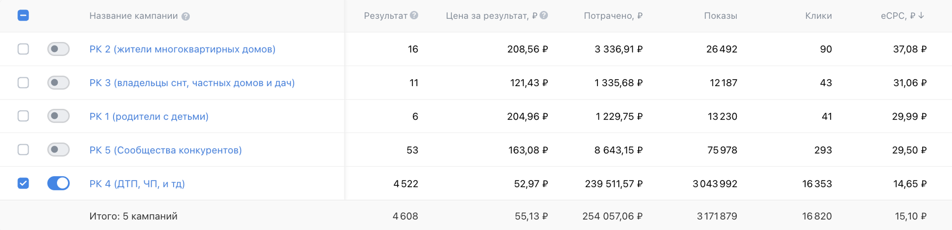 - Настройка и таргетинг: Кампании были детально сегментированы по интересам, поведенческим факторам, геолокации (Санкт-Петербург и Ленинградская область), аудиториям по конкурентам и ключевым фразам. Было запущено и проанализировано 6 отдельных рекламных кампаний.
