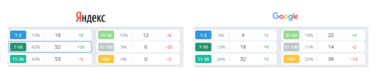 Топ-1–3 в Яндексе: рост с 13% до 42% (с 16 до 52 запросов)