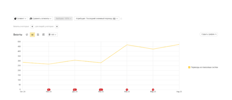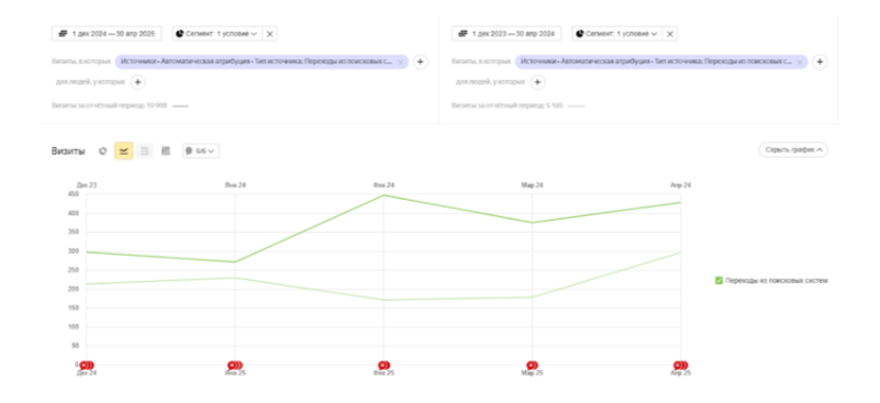 — с 297 визитов в декабре до 428 в апреле — +44%