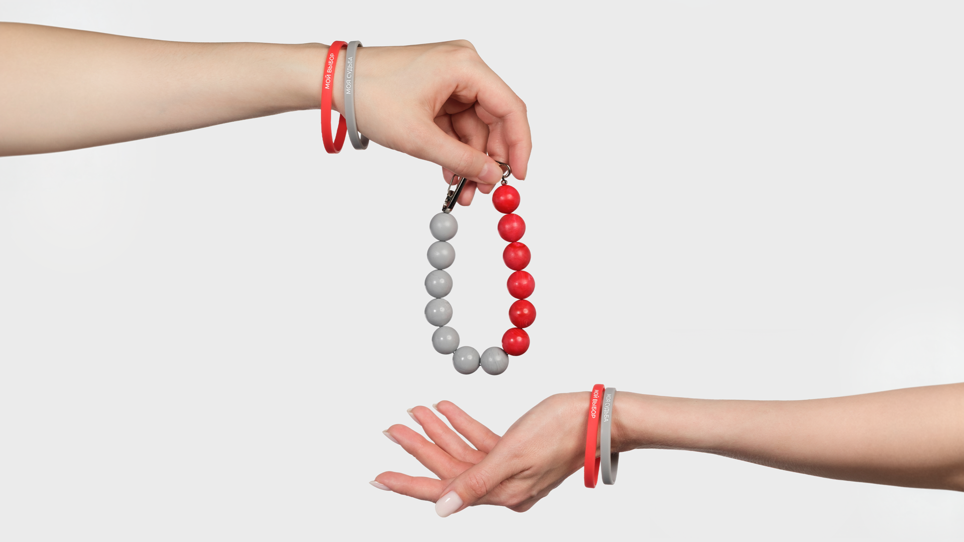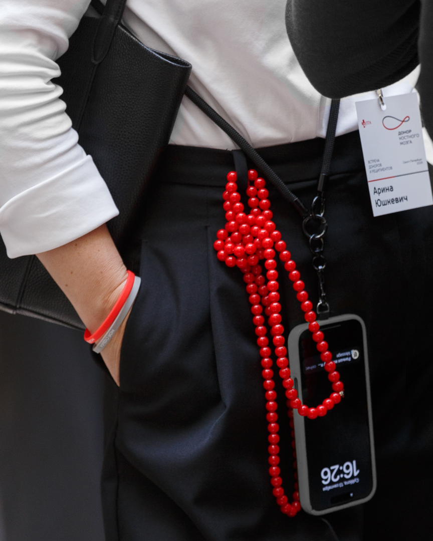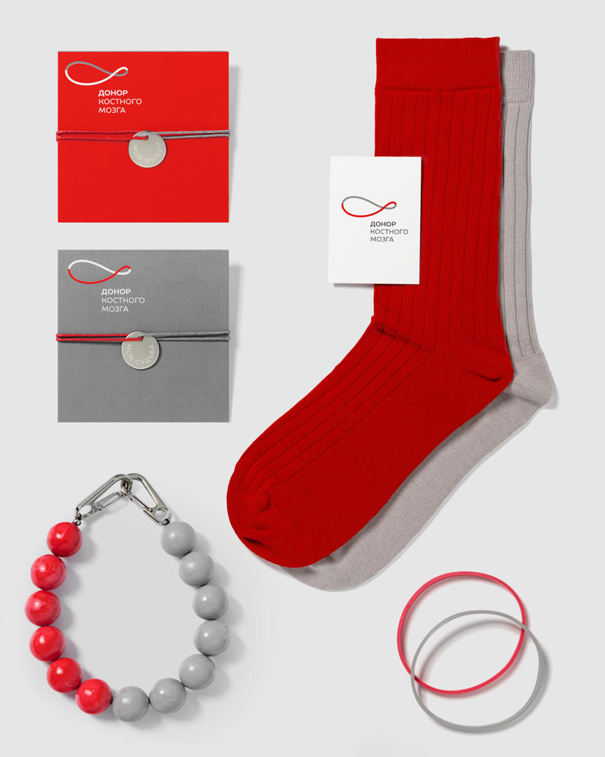 Специально для встреч доноров и их генетических близнецов были разработаны парные браслеты. Их дизайн, где переплетаются красная и серая нити, напрямую повторяет графику основного символа и напоминает о бесконечном переплетении человеческих судеб. На металлических подвесках были размещены соответствующие послания: для донора — «Мой выбор», а для реципиента — «Моя судьба».