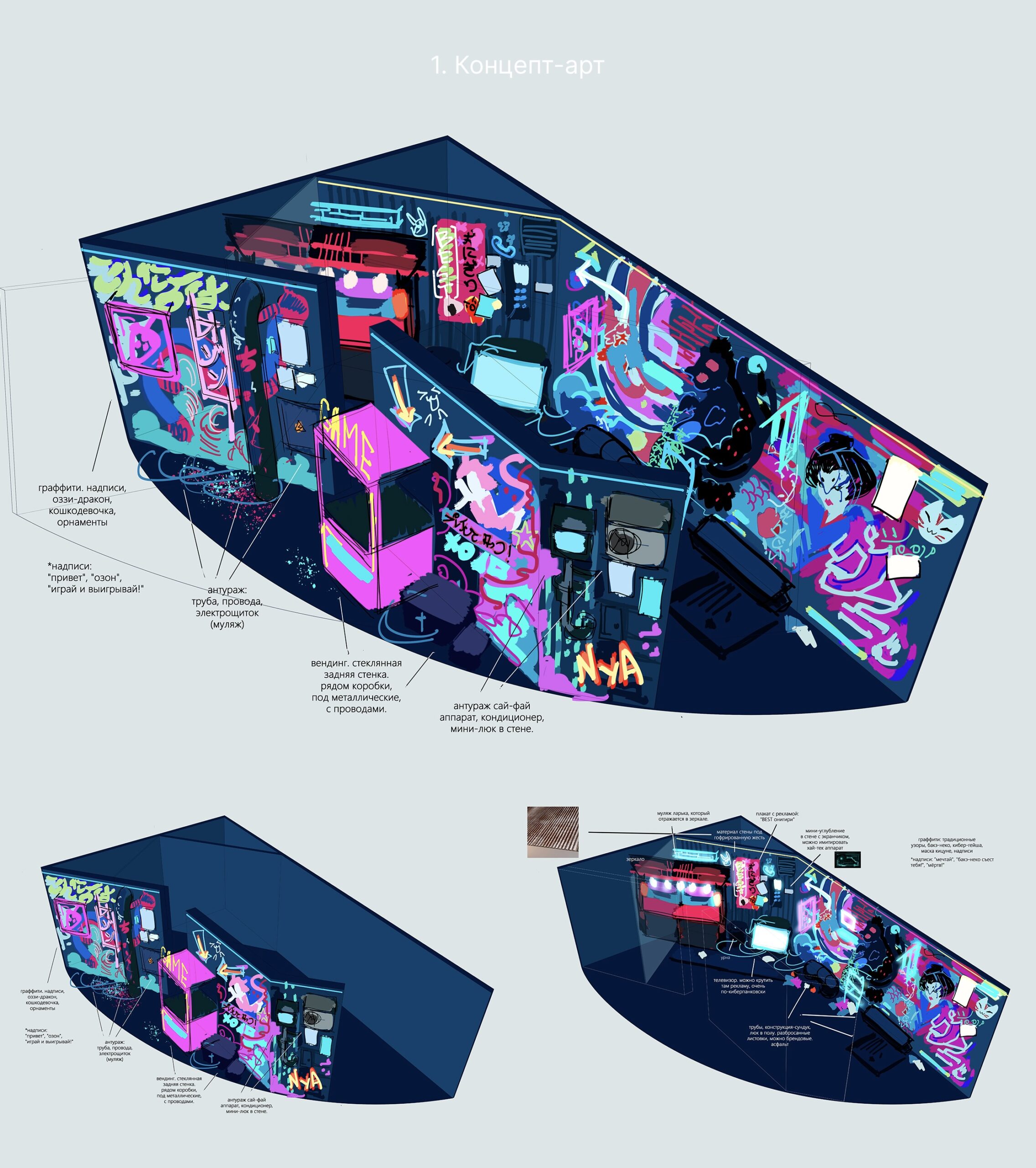 Художники и дизайнеры агентства погрузились в изучение визуального кода киберпанка: граффити, иероглифы, неоновая подсветка, нависающие конструкции. Были созданы десятки концепт-артов и подробных 3D-визуализаций, чтобы каждый квадратный сантиметр пространства — от фактуры стен до формы стойки — работал на общую идею.