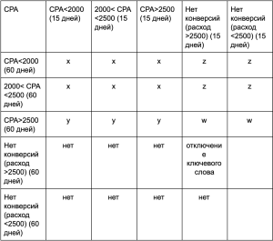 Эффективный, но не широко известный подход. Его суть заключается в разделении запросов на группы в зависимости от CPA за два временных периода: короткий (15 дней) и длительный (60 дней). Это позволяет отслеживать динамику изменения стоимости целевого действия по каждой группе.