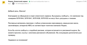 С 20 марта Яндекс начал блокировать объявления, содержащие аббревиатуру ИВЛ. Мы обратились в службу поддержки и получили ответ: