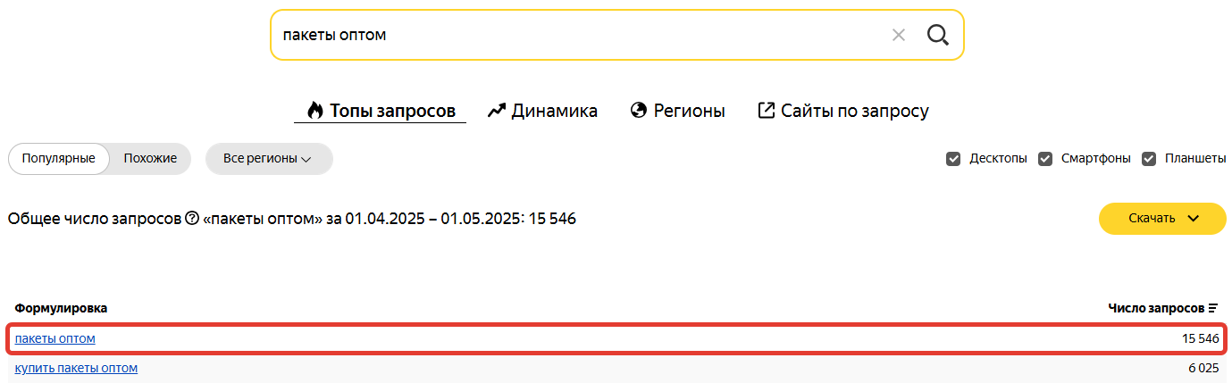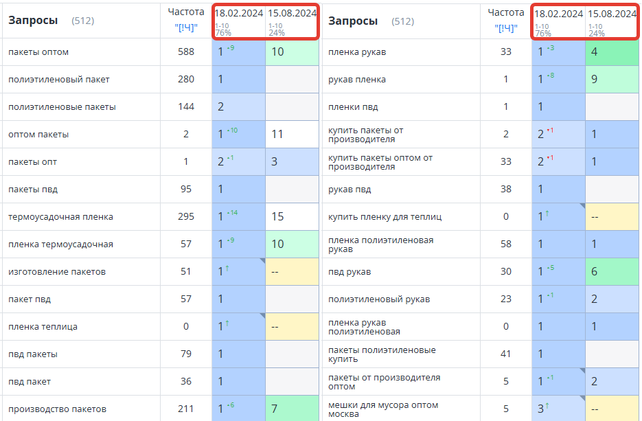 Среди успешно продвинутых фраз – высокочастотные коммерческие запросы: «пакеты оптом» (частотность 15 586)