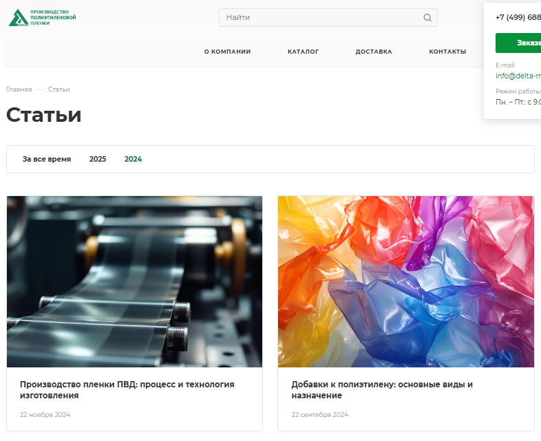 Контентное наполнение. На сайте создан раздел экспертных статей, содержащий материалы о технологиях производства полиэтиленовой продукции, особенностях различных видов пленки и областях их применения. Все тексты созданы с учетом требований поисковой оптимизации и включают целевые ключевые запросы.