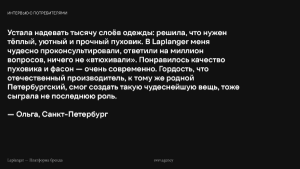 Заказчик проекта: компания Laplanger с 1991 года занимается R&D и производством высококачественных пуховиков, рассчитанных на мороз до минус 60 градусов. Фабрика расположена в Санкт-Петербурге на территории памятника промышленной архитектуры «Красный треугольник». Наличие отработанных технологических процессов и широкой сети дилеров позволило владельцам начать масштабирование бизнеса. Чтобы кратко и точно доносить до потребителей преимущества продукта и не тратить рекламный бюджет на нецелевую аудиторию, компания обратилась в агентство за разработкой платформы бренда.
