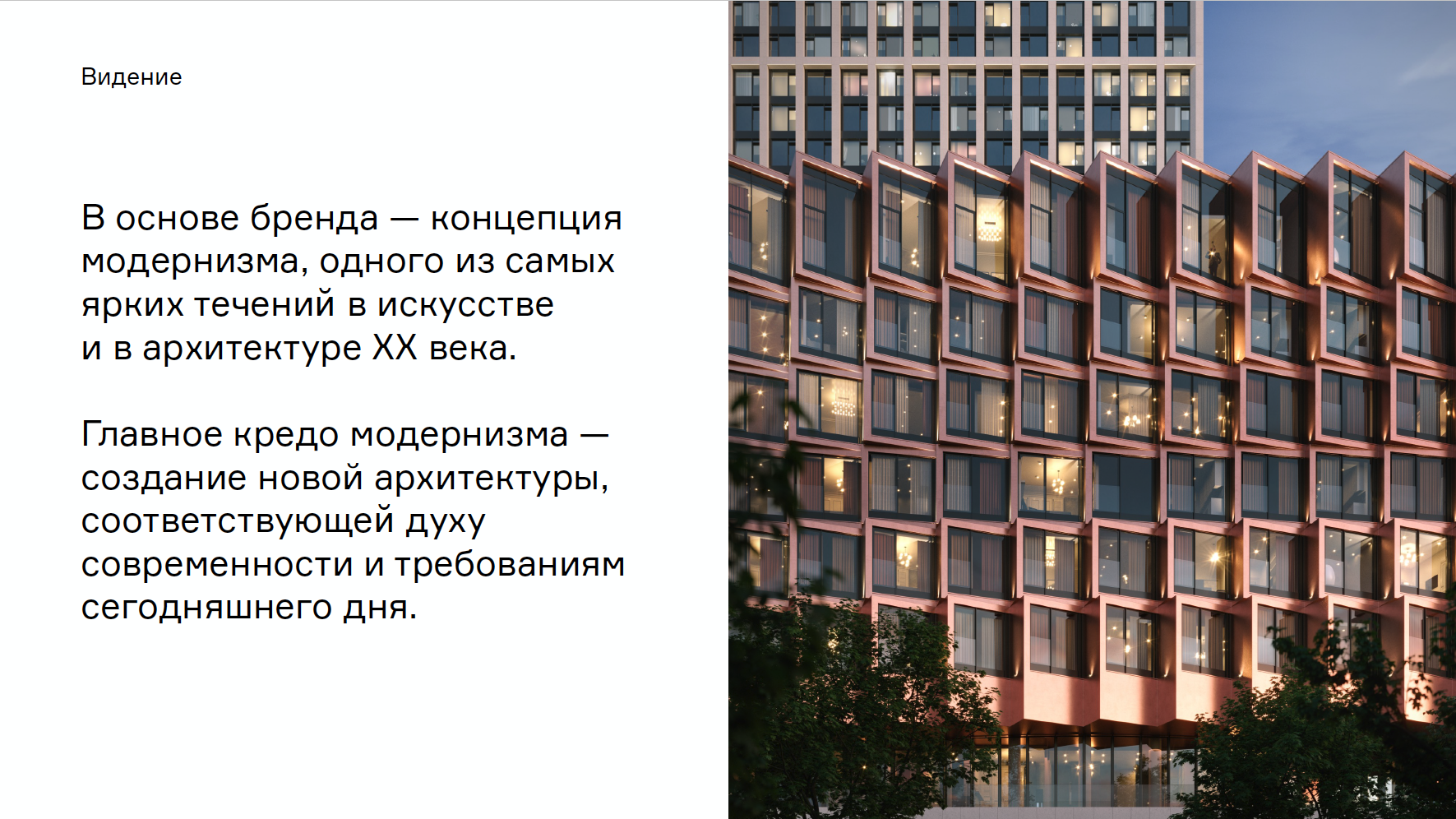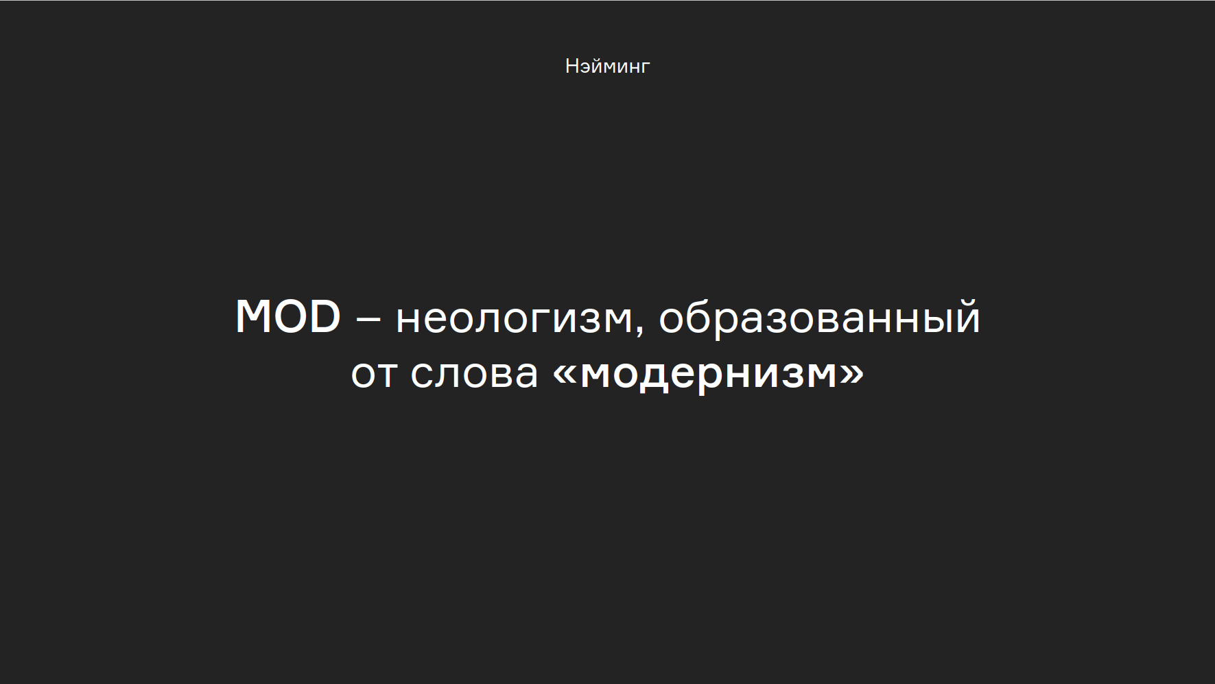 Главным кредо модернизма является новая архитектура, которая соответствует духу современности, отвечает требованиям сегодняшнего дня. В нейминге ЖК это тоже нашло отражение: сокращенное слово „модернист“ стало смелым и дерзким именем нового бренда — MOD.