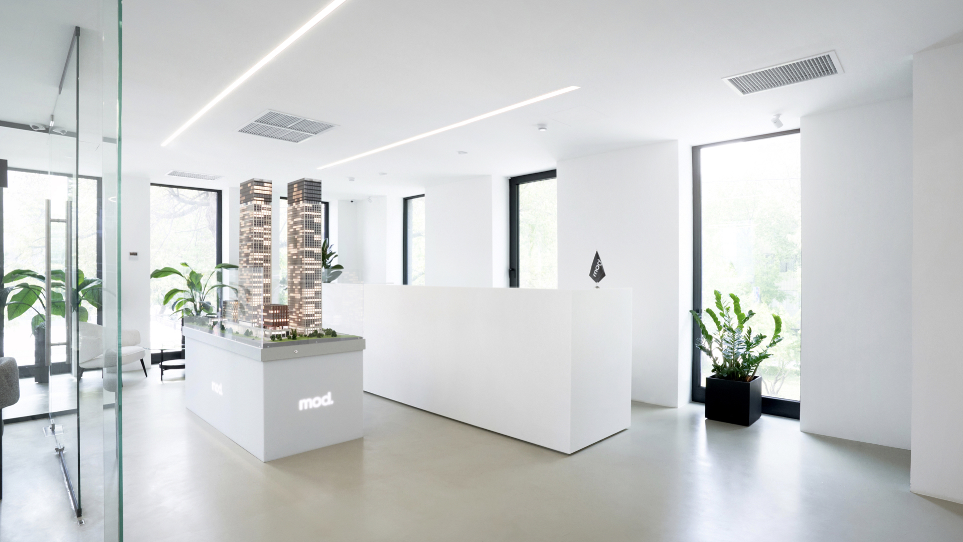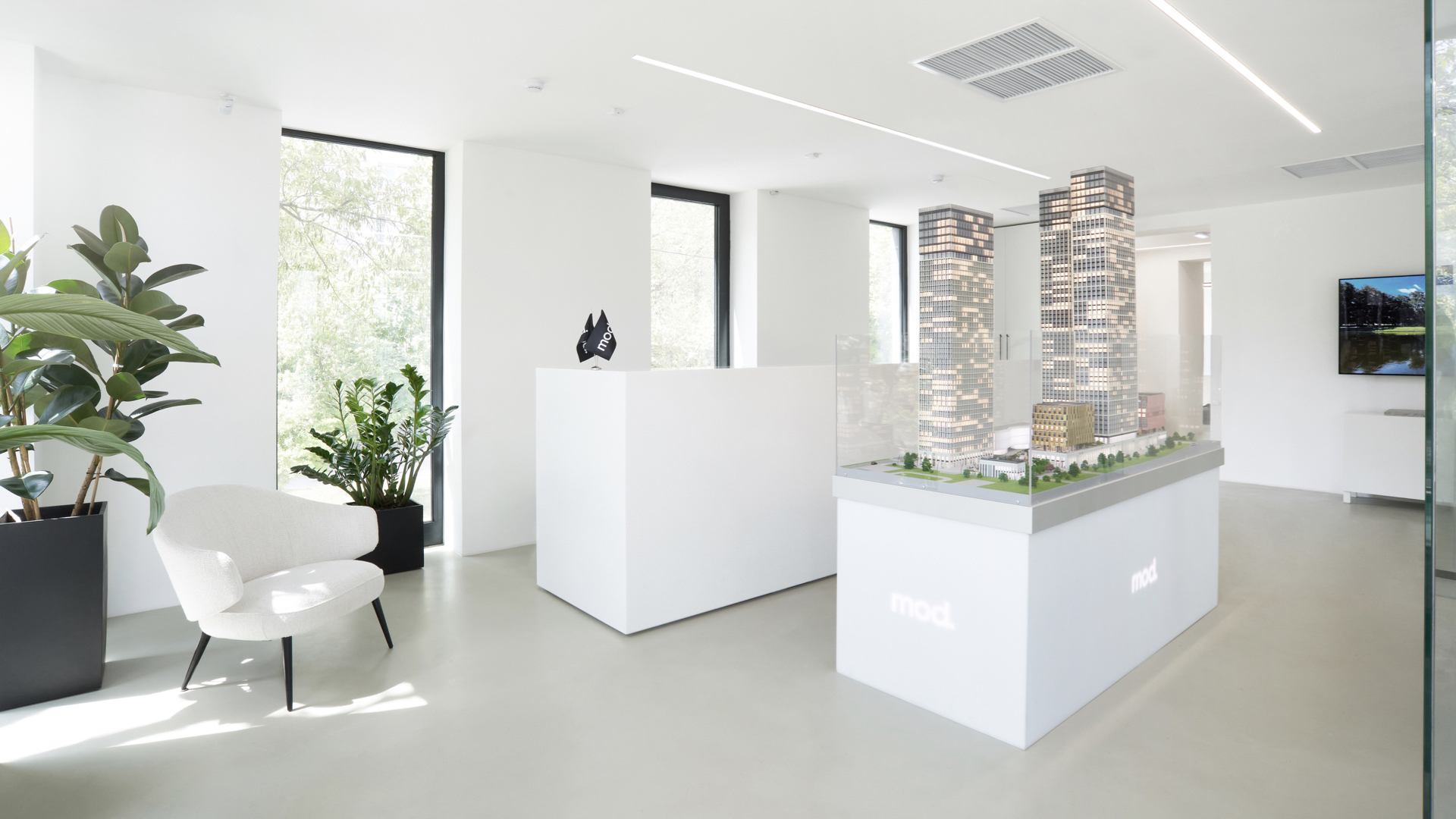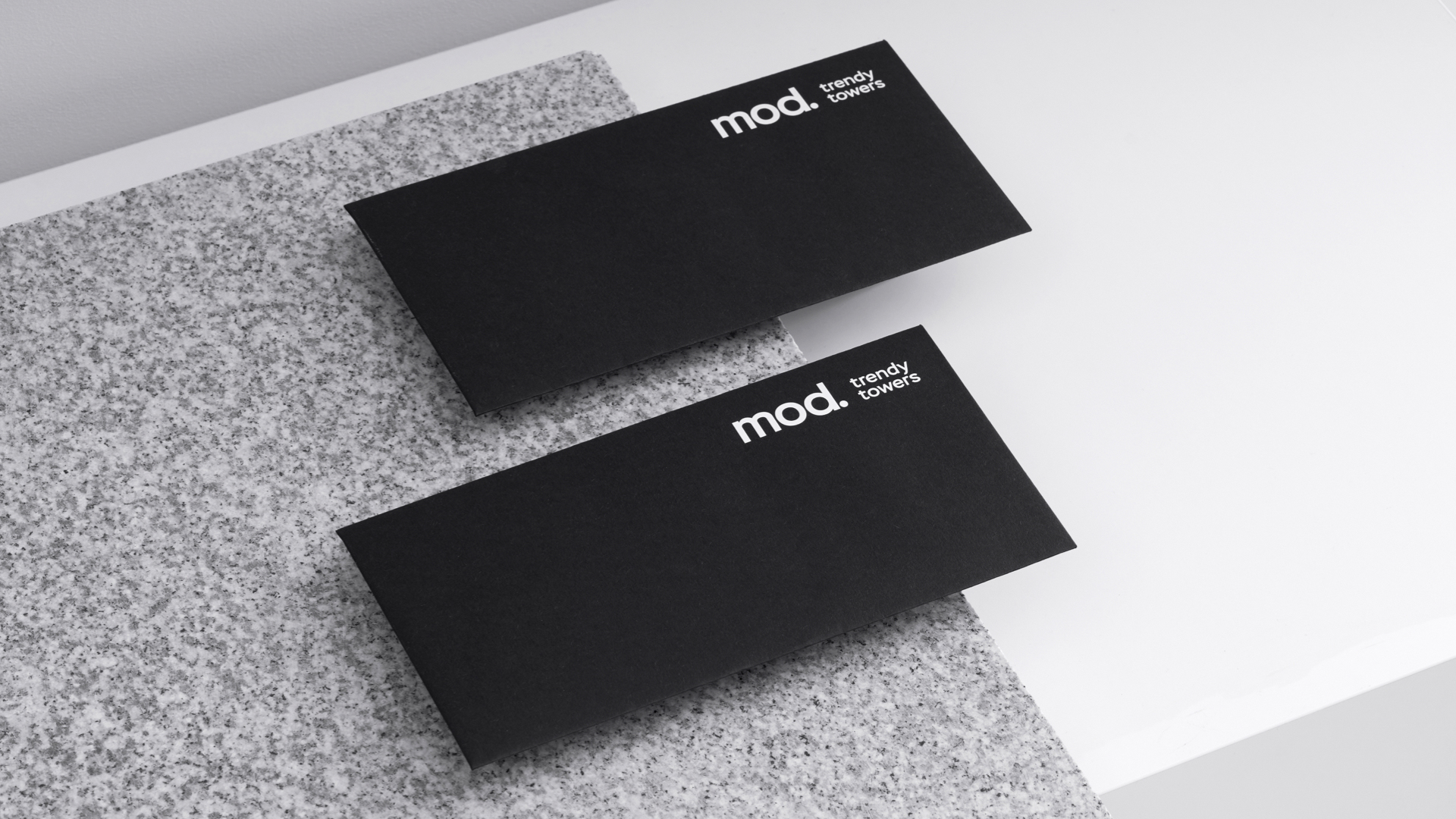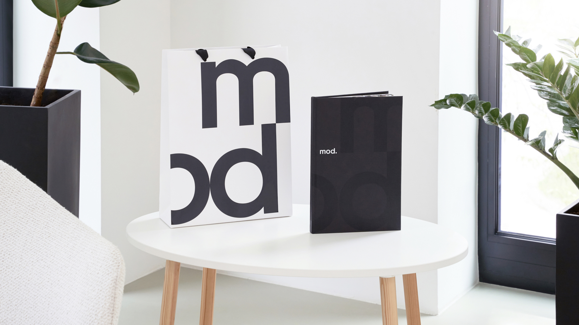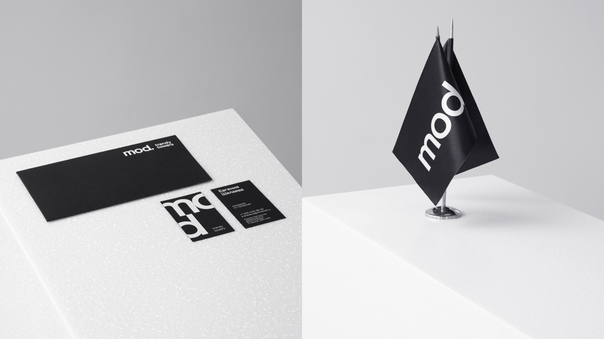 Дизайнерское решение брендингового проекта построено на контрасте форм. Фирменная графика основывается на “игре” черного и белого, глянца и матовых покрытий, что создает ощущение стиля. Характер бренда MOD выражается с помощью выверенного минимализма и пронизывающей самоуверенности.