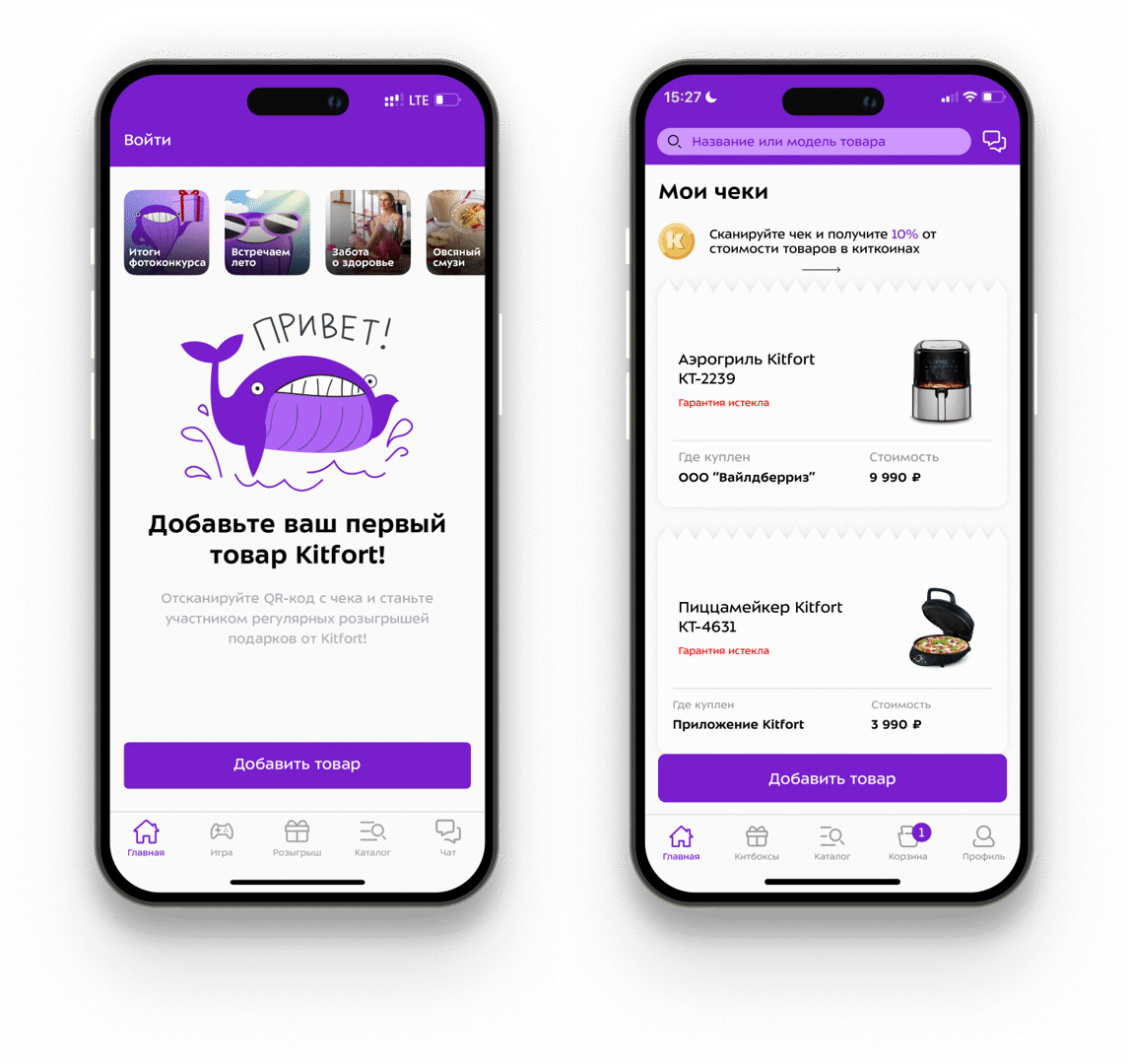Пользователям предоставлена возможность вносить в приложение чеки за приобретение товаров Kitfort, совершенные на официальном сайте или других электронных площадках, для получения бонусных баллов.