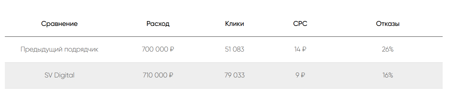 Специалистам SV Digital удалось сохранить бюджет на том же уровне, но использовать его более рационально. За счет этого уже через 3 месяца заказчик отметил достижение всех поставленных KPI: