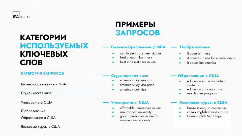 - Сбор и сегментация ~900 поисковых запросов на тему обучения и переезда в США.