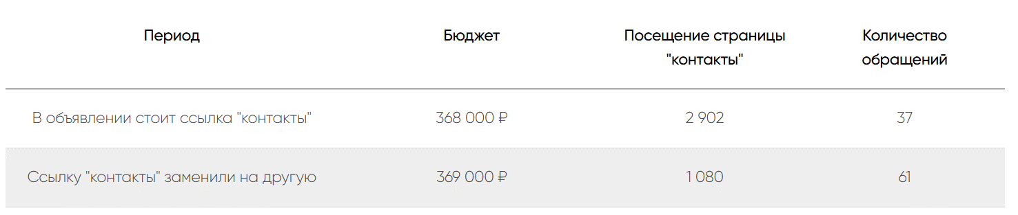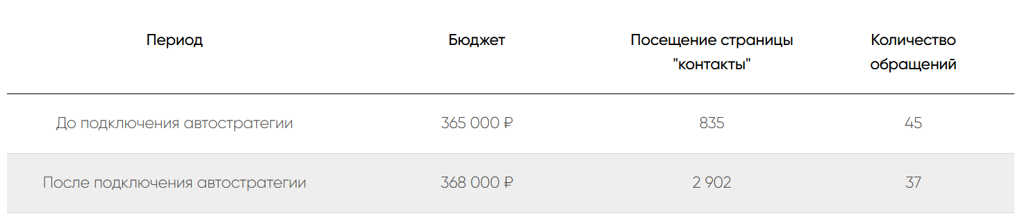 Анализируя данные, специалисты обнаружили важную корреляцию: пользователи, которые посетили «Контакты» после изучения сайта, конвертировались в заявки чаще. После этого было принято решение подключить автостратегию и оптимизировать ее под эту микроцель. В частности, в РСЯ появился баннер с быстрой ссылкой на страницу «Контакты».