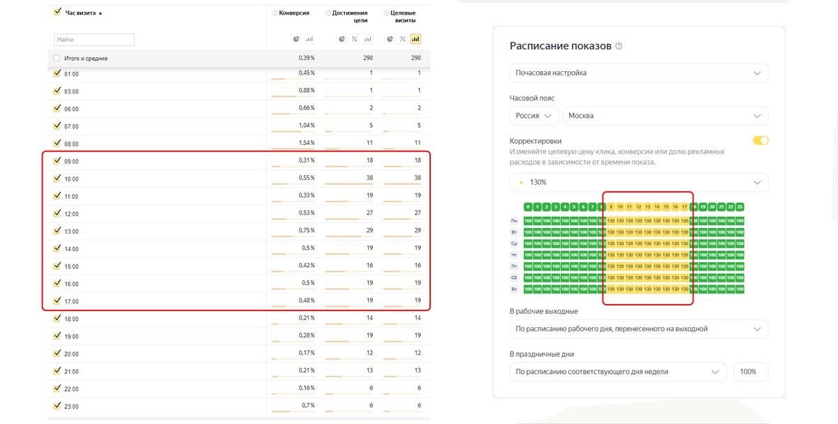 - ввели понижающие корректировки ставок для женской аудитории и, наоборот, повысили их в часы пиковой активности, чтобы получить как можно больше заявок;