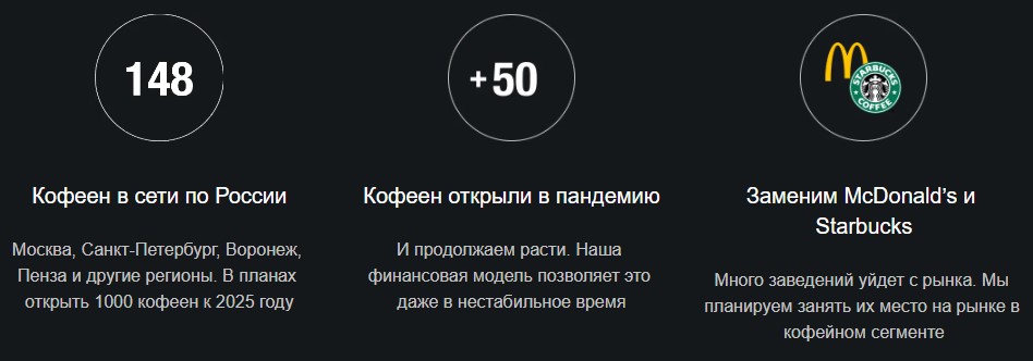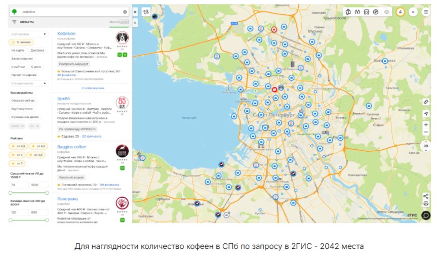 Для наглядности: только в СПб по данным 2ГИС зарегистрировано 2042 кофейни, что делает борьбу за внимание потенциального франчайзи особенно сложной.