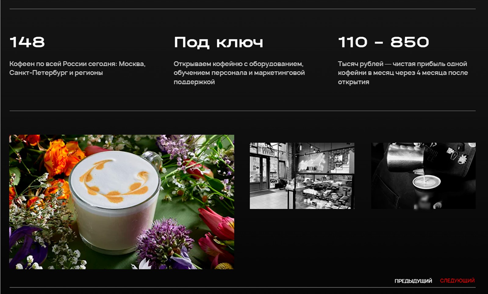 Сеть кофеен формата «кофе с собой», активно продающая франшизы. На момент начала работы это была крупнейшая сеть такого формата на Северо-Западе страны.