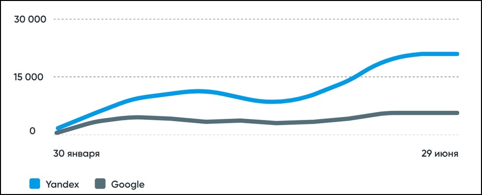 Была создана стратегия продвижения сайта. До начала работ сайт занимал третье место в поисковой выдаче Яндекса лишь на 26%. Это значительно меньше, чем у конкурентов. В то же время, видимость в поисковой выдаче Google практически отсутствовала.