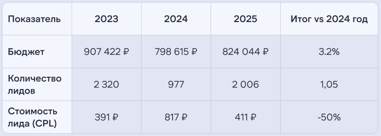 После спада в 2024 году нам удалось более чем в 2 раза сократить стоимость лида и удвоить их количество, вернувшись к показателям 2023 года, но с более оптимизированным и современными инструментами