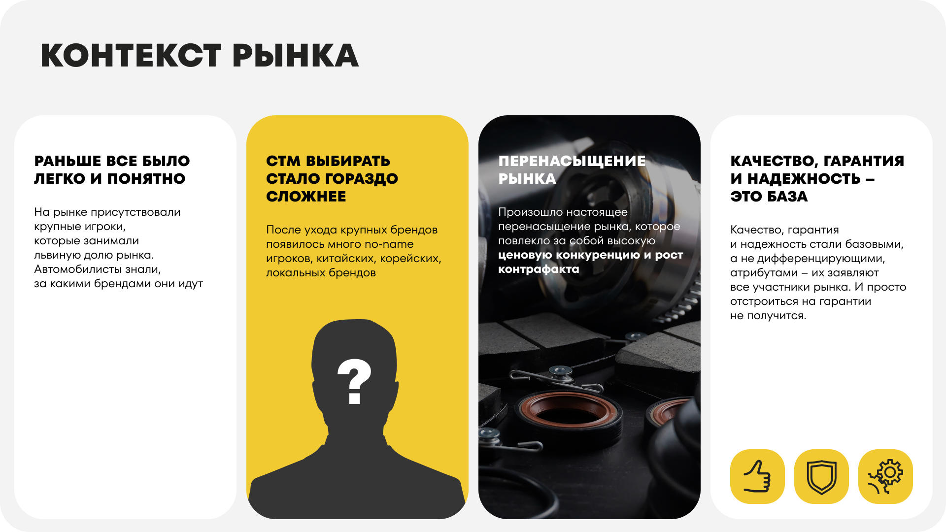 Кейс агентства Heads рассказывает о разработке бренд-стратегии для производителя автокомпонентов. Команда Heads разработала стратегию позиционирования и коммуникационную платформу для российского производителя автокомпонентов. Перед специалистами стояла задача усилить узнаваемость бренда и изменить его восприятие: перейти от ассоциаций исключительно с российским автопромом к образу современного технологичного бренда, способного успешно конкурировать в новых категориях, включая рынок комплектующих для иномарок.
