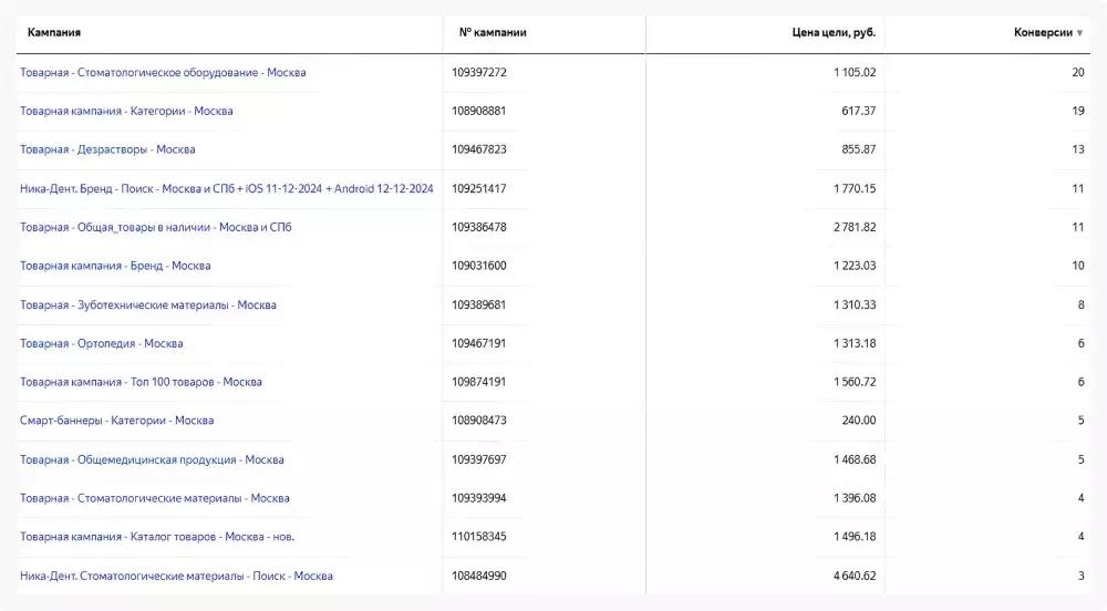 Первоначально цели рекламных кампаний основывались на данных предыдущих периодов, согласно которым стоимость привлечения составляла около 700-1000 рублей. Клиент хотел сохранить прежнюю ситуацию, формулируя запрос следующим образом: «Нам бы вернуть цену обращений, как раньше». Однако очевидно, что в условиях современной рыночной конъюнктуры, обусловленной особенностями аукционов рекламной площадки «Яндекс» и общей инфляцией, достигнуть подобного уровня стоимости невозможно, и нам пришлось адаптироваться к актуальным рыночным условиям.