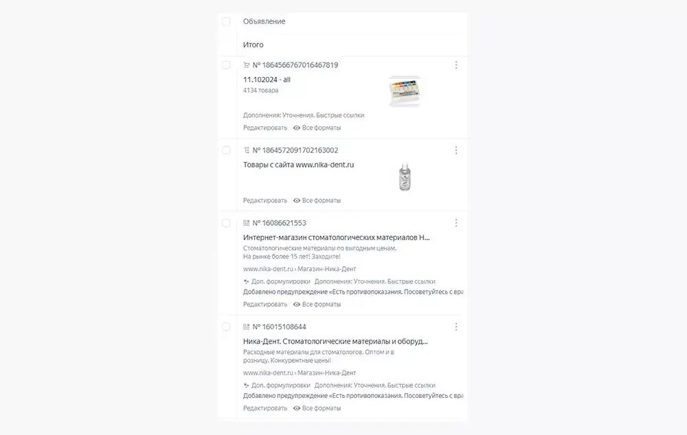 Отдельно отметим существование обширных общих запросов типа «стоматологические материалы» и «расходники», которые охватывают всю тематику целиком, но неясно, насколько эффективно такое продвижение принесет доход бизнесу.