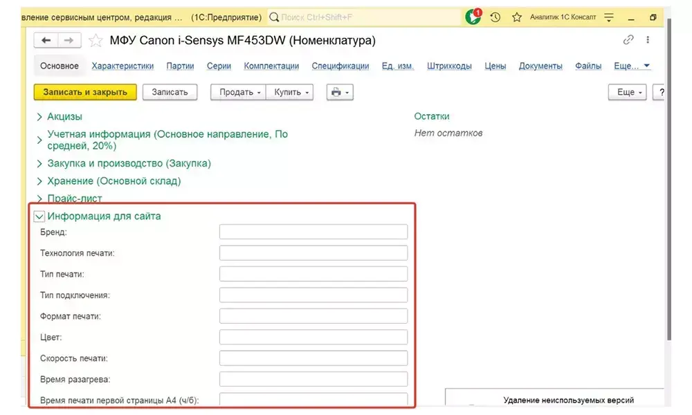 Затем возникло затруднение с правильной передачей описательной информации о товаре. Проблема заключалась в том, что описание анонса не поступало, так как считалось «реквизитом». Решение нашли путем корректировки настроек полей: присвоили полю XML-значение «Полное наименование», а полю 1С — «Описание». После этого всё заработало идеально.