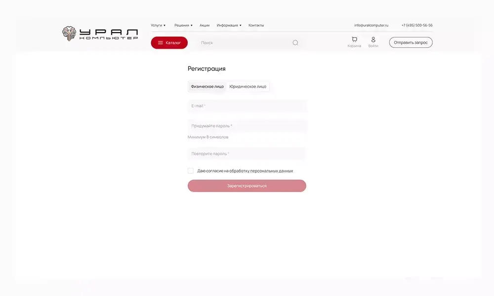 Обновление внешнего вида каждого раздела проводилось с учетом обновленных требований, особенно тех, что направлены на повышение удобства покупок для обычных потребителей. Так, была пересмотрена структура процесса регистрации и устройства личного кабинета. Теперь пользователям предлагается выбрать свою роль (“организация” либо “частное лицо”) непосредственно при регистрации.