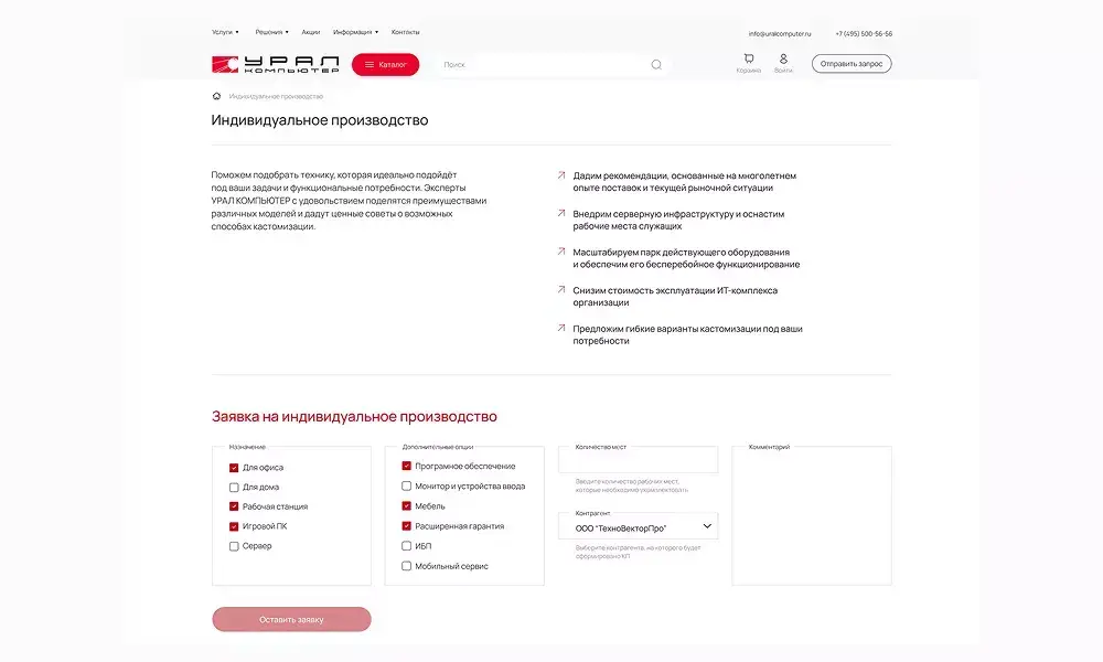 Оформление было утверждено, сайт запущен, тестирование успешно завершилось. Казалось бы, работа подошла к концу, однако неожиданно возникла новая ситуация. Заказчик сообщил о слиянии двух известных брендов — УралЗвук и OLDI Computers, результатом которого стала компания УРАЛ КОМПЬЮТЕР. Теперь ей понадобилась универсальная онлайн-платформа, способная обслуживать одновременно и корпоративный сектор, и розничных потребителей.
