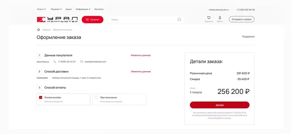 Процесс оформления заказа организован традиционно через корзину, куда пользователь добавляет выбранные товары. При этом покупателю-партнеру автоматически применяется соответствующая скидка. Важный нюанс заключается в выборе контрагента, от имени которого формируется коммерческое предложение.
