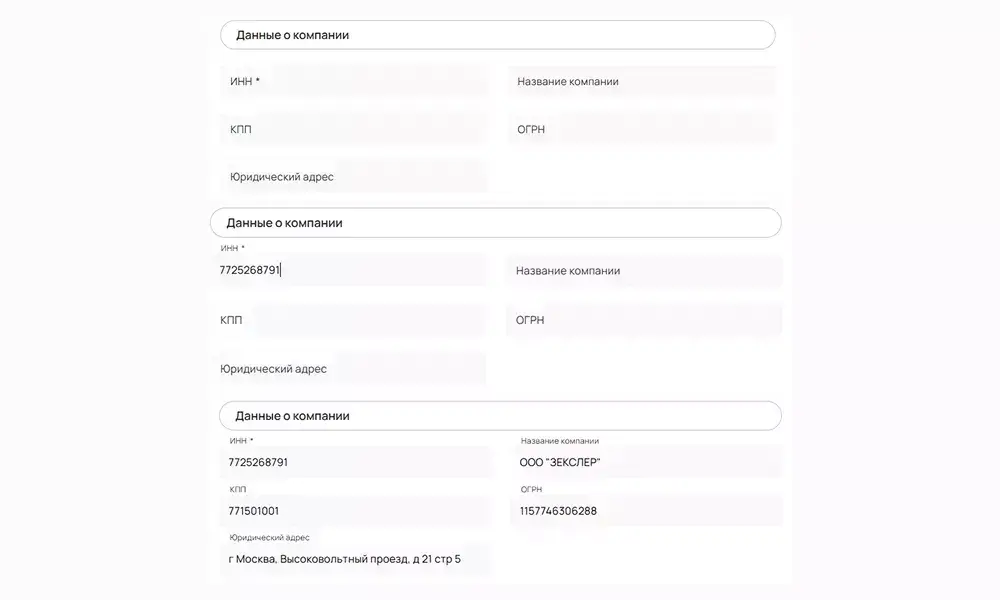 При регистрации юридического лица (или при создании нового контрагента в профиле пользователя) была интегрирована удобная функция автоматического заполнения полей по введенному ИНН. Благодаря этому нововведению существенно сокращается время на ручное внесение реквизитов и последующую их проверку.