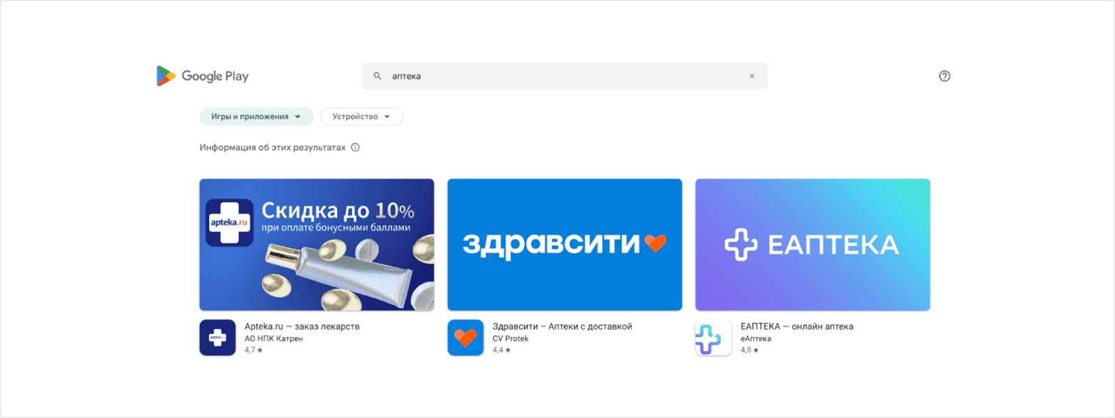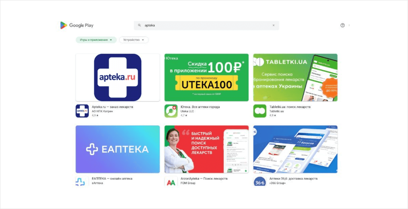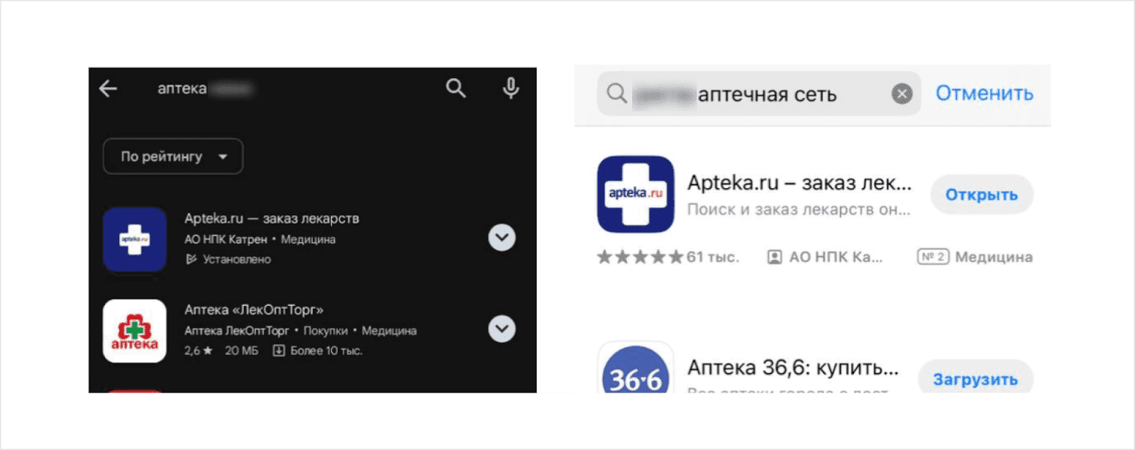 Приложение также стало занимать первые позиции по запросам, связанным с конкурентами и популярными аптечными брендами.