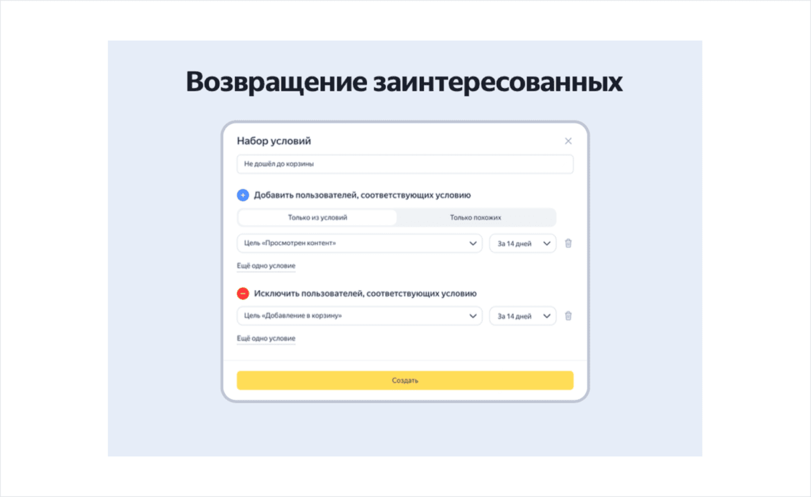 Аудитории необходимо делить по действиям и сценарию: «брошенная корзина», отсутствие заказов в течение 30 дней и др.