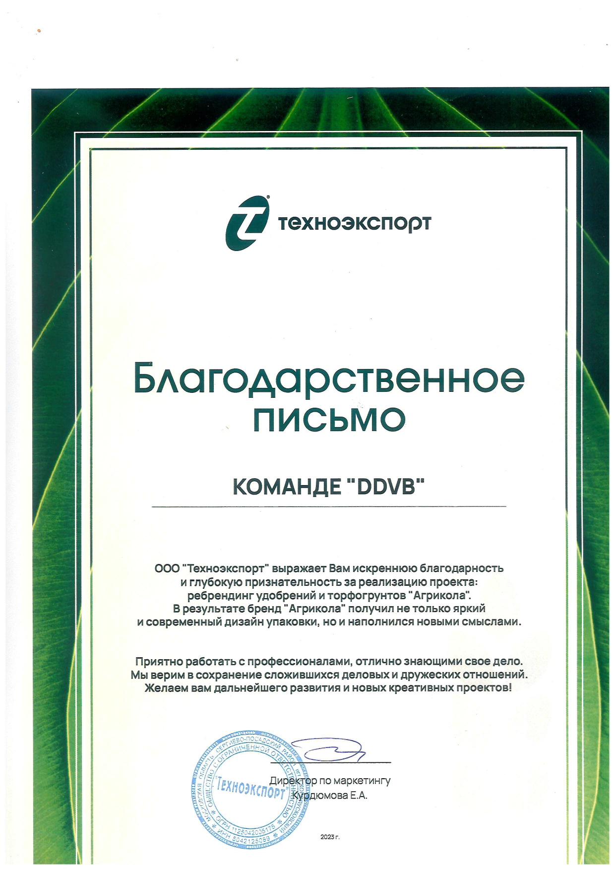 Мы благодарны DDVB за хорошую работу над платформой бренда „Агрикола“. В нашем представлении, агентство DDVB отличает системный подход к решениям, умение видеть общую картину и обращать внимание на частности. Мы работали одной большой командой, и ребята всегда учитывали наши пожелания, при этом вели нас в верном направлении на пути к пониманию нашего бренда. В результате наш бренд наполнился смыслами и получил хороший фундамент для дальнейшего развития