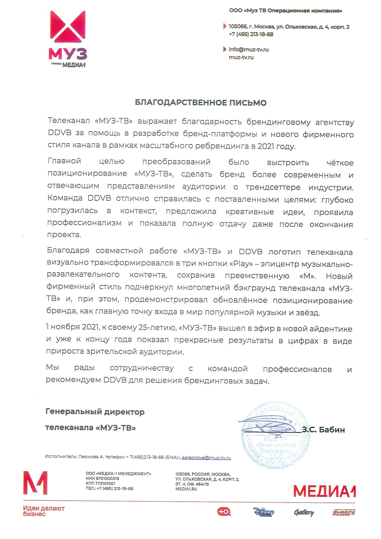 Главной целью преобразований было выстроить чёткое позиционирование МУЗ-ТВ, сделать бренд более современным и отвечающим представлениям аудитории о трендсеттере индустрии. Команда DDVB отлично справилась с поставленными целями: глубоко погрузилась в контекст, предложила креативные идеи, проявила профессионализм и показала полную отдачу даже после окончания проекта.