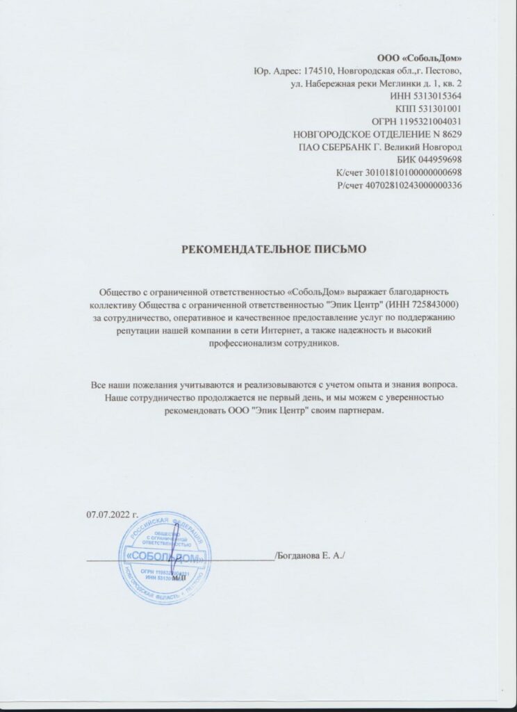 Общество с ограниченной ответственностью «СобольДом» выражает благодарность коллективу Общества с ограниченной ответственностью “Эпик Центр” (ИНН 725843000) за сотрудничество, оперативное и качественное предоставление услуг по поддержанию репутации нашей компании в сети Интернет, а также надежность и высокий профессионализм сотрудников.