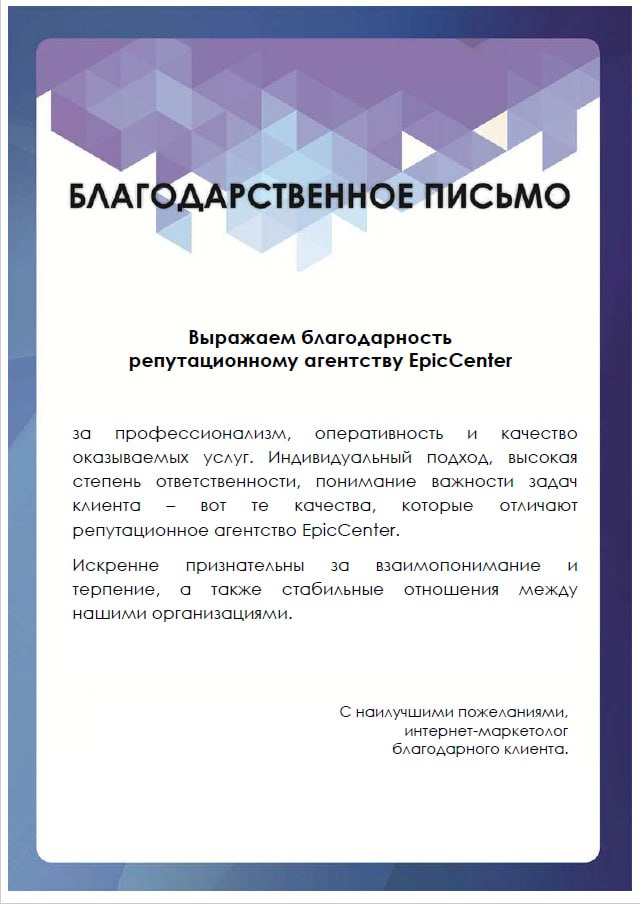 за профессионализм, оперативность и качество оказываемых услуг. Индивидуальный подход, высокая степень ответственности, понимание важности задач клиента- вот те качества, которые отличают репутационное агентство EpicCenter.