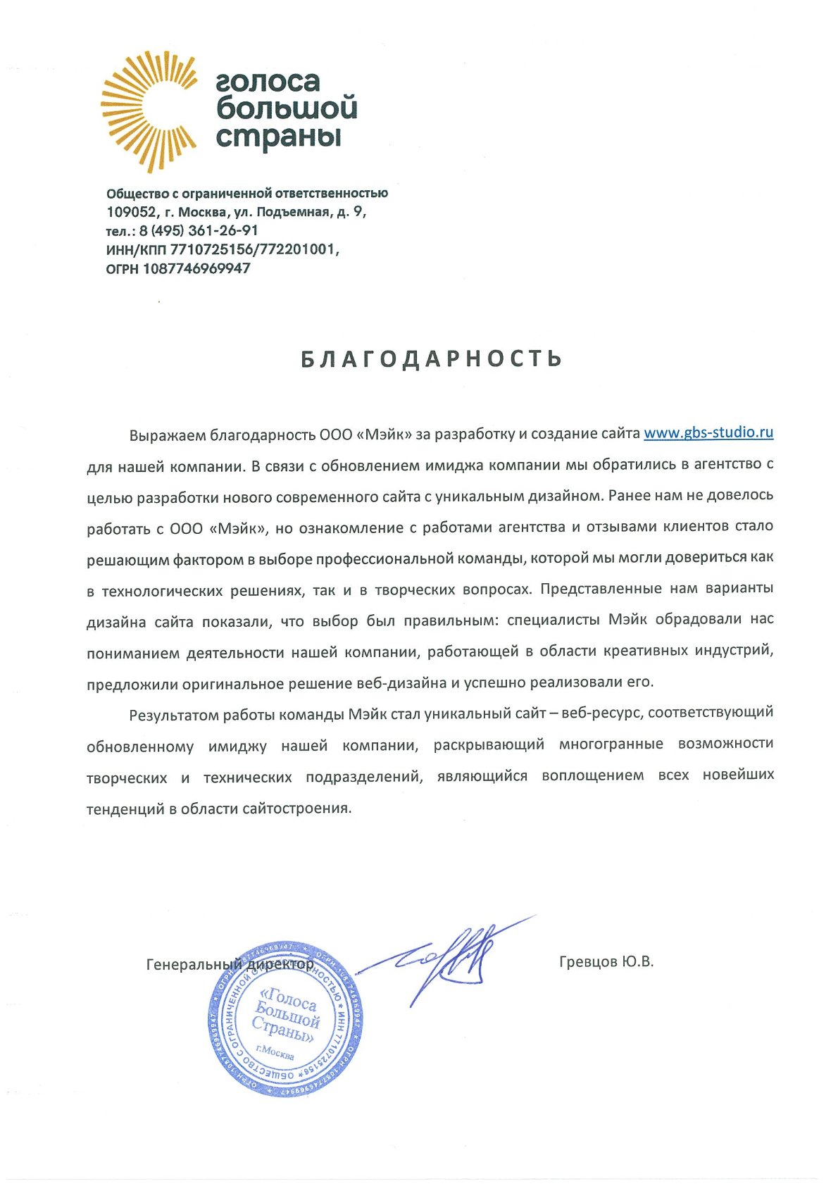 Выражаем благодарность ООО «Мэйк» за разработку и создание сайта gbs-studio.ru для нашей компании. В связи с обновлением имиджа компании мы обратились в агентство с целью разработки нового современного сайта с уникальным дизайном.