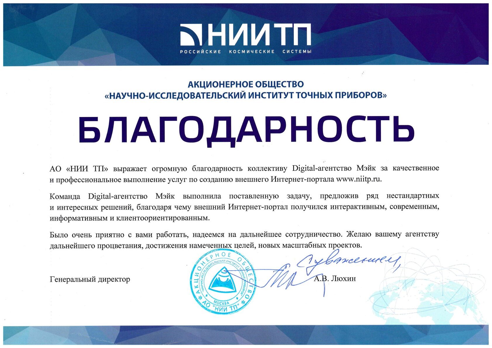 АО «НИИ ТП» выражает огромную благодарность коллективу Digital-агентства «Мэйк» за качественное и профессиональное выполнение услуг по созданию внешнего Интернет-портала niitp.ru.