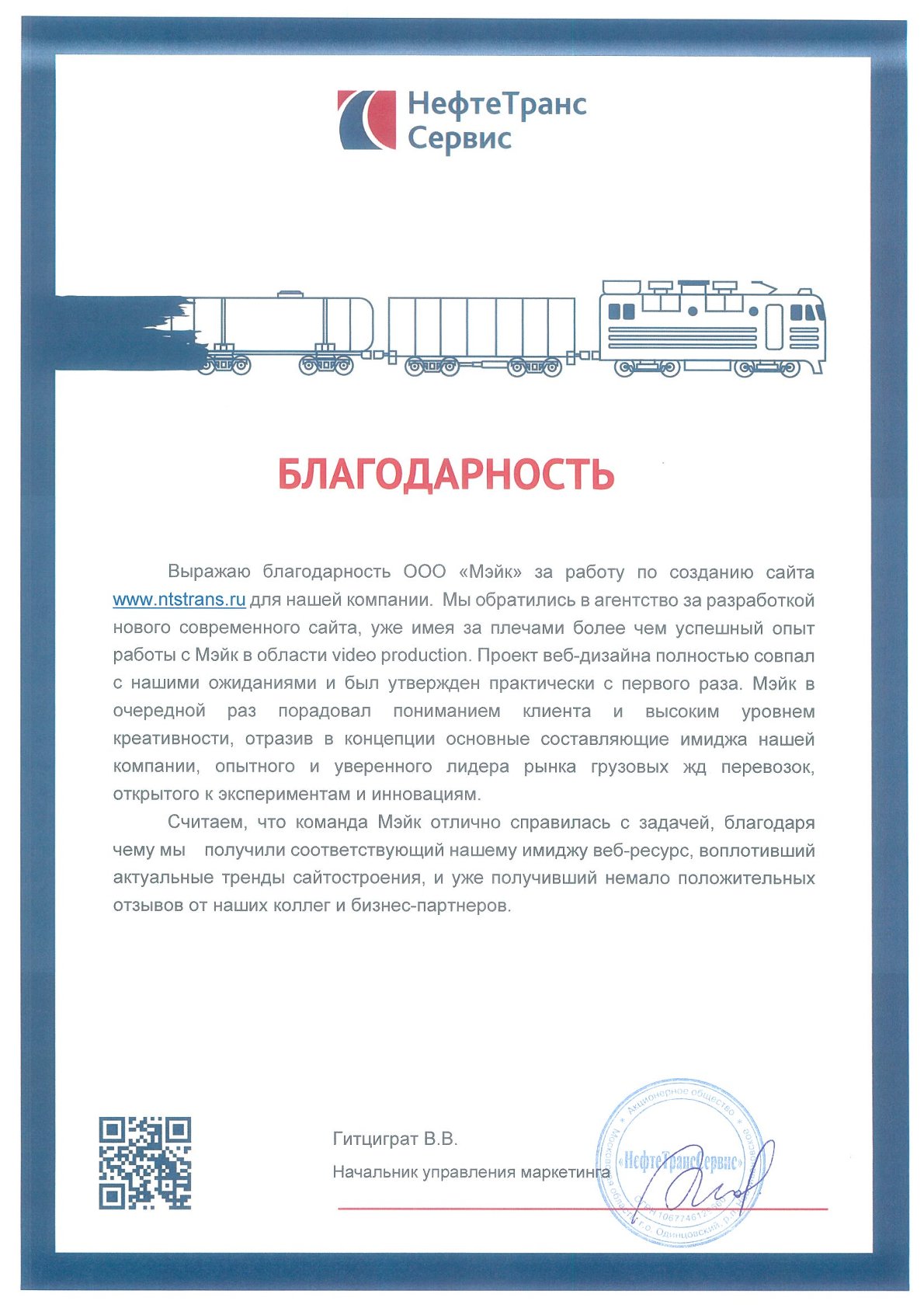 Выражаю благодарность ООО «Майк» за работу по созданию сайта www.ntstrans.ru для нашей компании.
