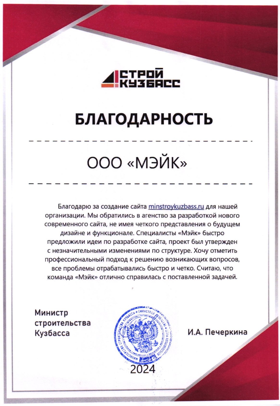 Благодарю за создание сайта minstroykuzbass.ru для нашей организации.