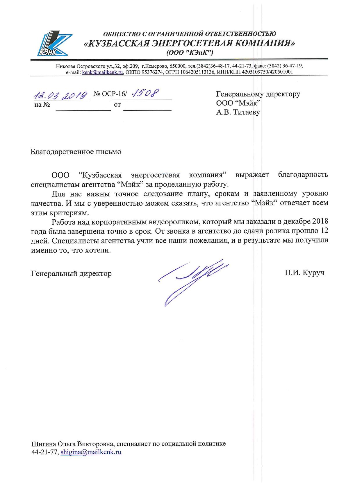 ООО «Кузбасская энергосетевая компания» выражает благодарность специалистам агентства «Мэйк» за проделанную работу.
