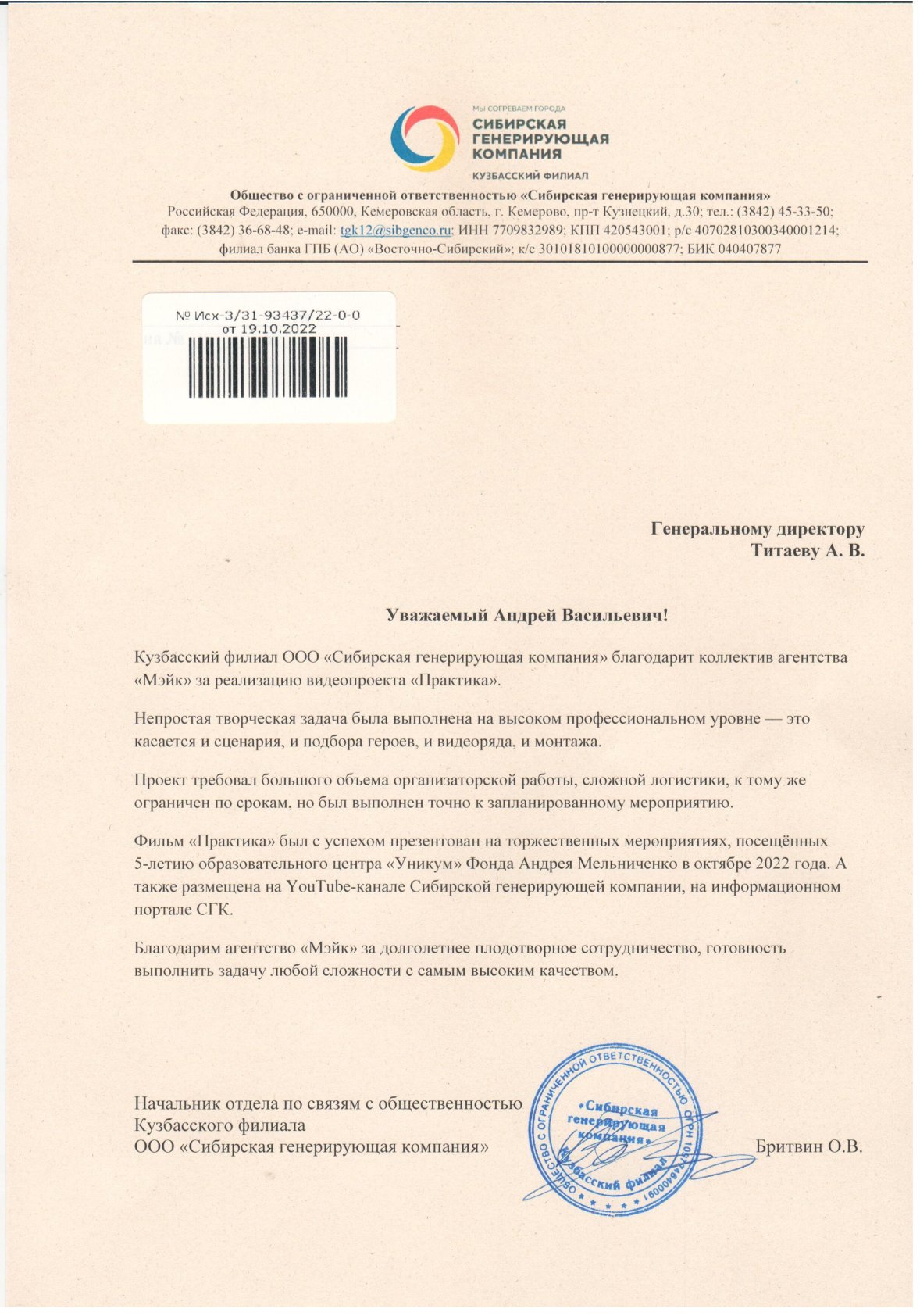 Кузбасский филиал ООО «Сибирская генерирующая компания» благодарит коллектив агентства «Мэйк» за реализацию видеопроекта «Практика».